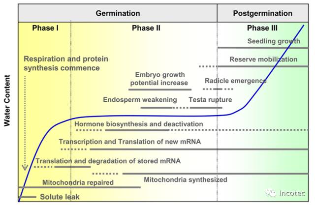 從這張圖片中我們可以看到:種子吸水的三個階段